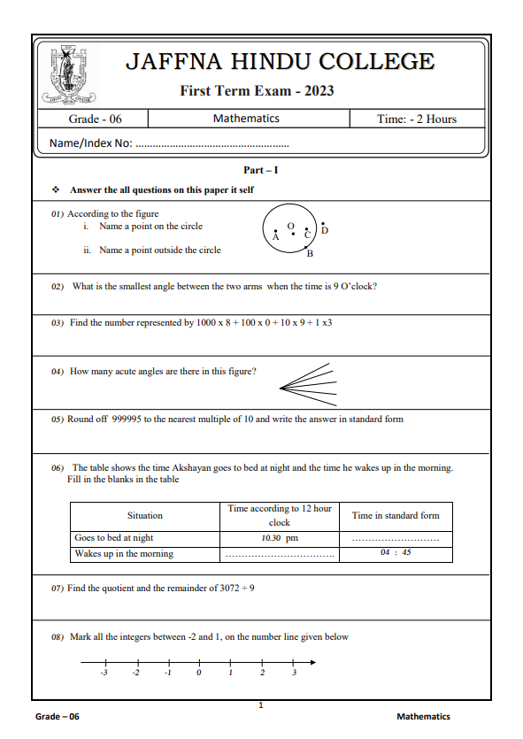 Grade 06 Mathematics First Term Examination Question Paper with Answers 2023 in English Medium. This is the Jaffna Hindu Collage First Term Examination Question Paper conducted in 2023. All English Medium students can download Grade 06 Mathematics Past Question Papers using the links below. It is free to download.