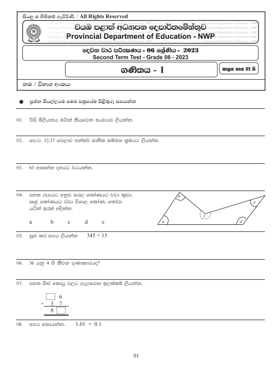 2023 North Western Province Grade 06 Maths 2nd term test paper with answers download in Sinhala medium. You can download the NWP term test paper as a PDF from the link below.