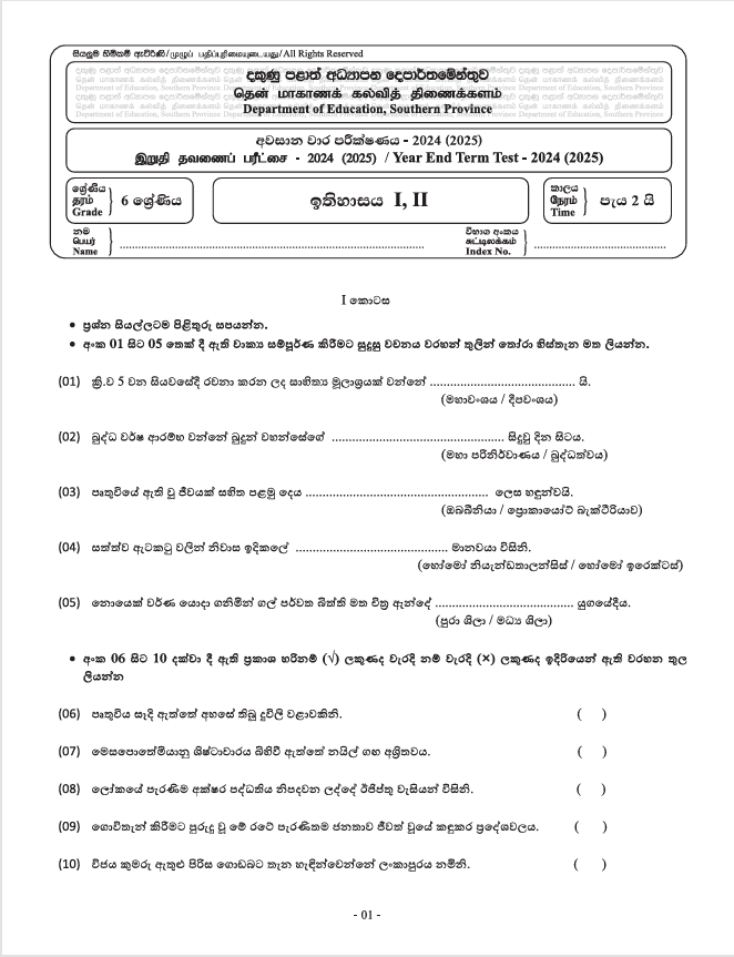 2024 Southern Province Grade 06 History 3rd Term Test paper with Answers, available for download in Sinhala Medium. You can access the Southern Province term test paper in PDF format using the link below.