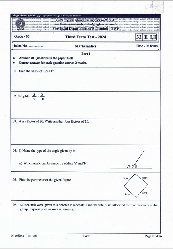 2024 North Western Province Grade 06 Mathematics 3rd Term Test paper, available for download in English Medium. You can access the North Western Province term test paper in PDF format using the link below.