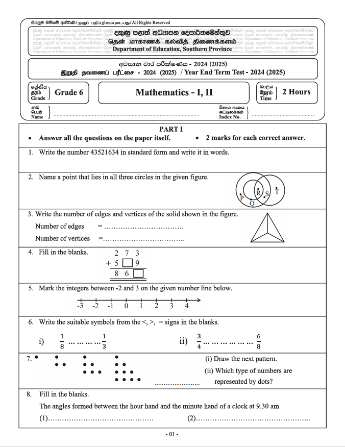 2024 Southern Province Grade 06 Mathematics 3rd Term Test paper, available for download in English Medium. You can access the Southern Province term test paper in PDF format using the link below.