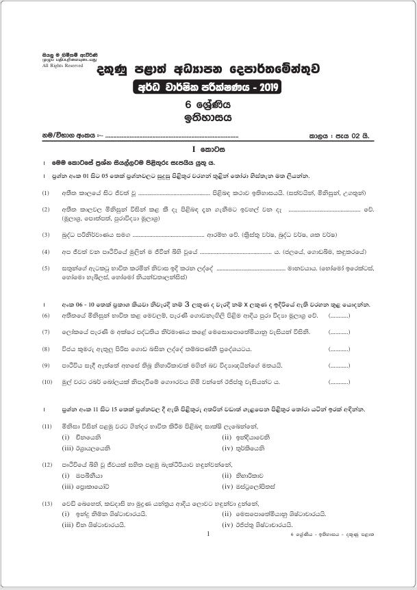 Download Grade 06 History paper in Sinhala Medium 2019