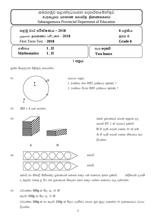 Grade 06 Mathematics First Term Examination Question Paper with Answers 2018 in Sinhala Medium. This is the Sabaragamuwa Province First Term Examination Question Paper conducted in 2018. All Sinhala Medium students can download Grade 06 Mathematics Past Question Papers using the links below. It is free to download.