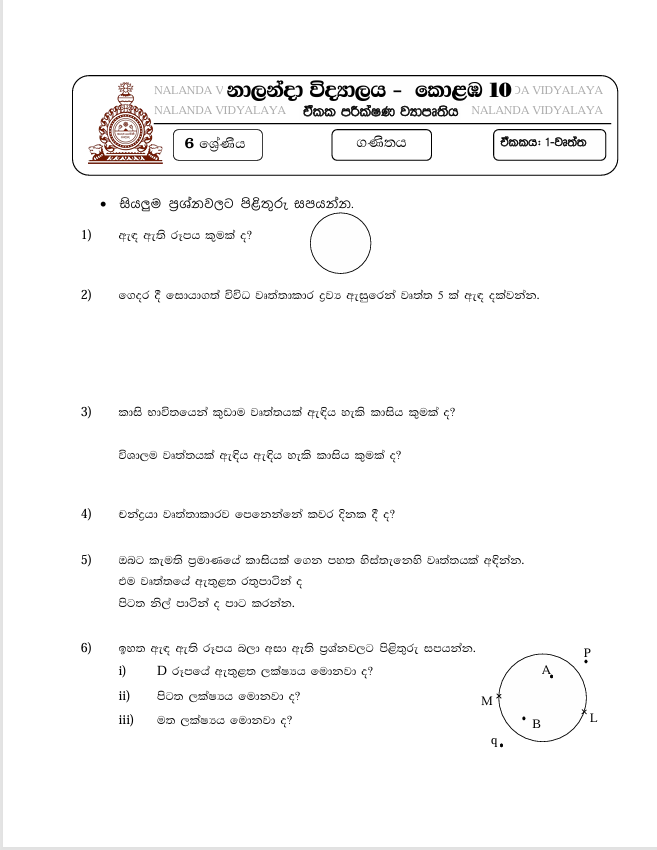 Grade 06 Mathematics Unit Test Paper Sinhala