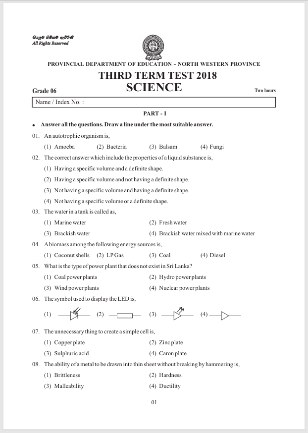 Grade 06 Science 3rd term test paper 2018 in English Medium. This is the North Western Province’s third term test exam Paper with Answers conducted in 2018. All English Medium students can download grade 06 Science past paper using the links below. It’s free to download.