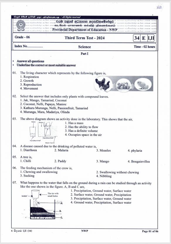 2024 North Western Province Grade 06 Science 3rd Term Test paper with answers, available for download in English Medium. You can access the North Western Province term test paper in PDF format using the link below.