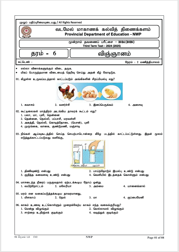 2024 North Western Province Grade 06 Science 3rd Term Test paper with answers, available for download in Tamil Medium. You can access the North Western Province term test paper in PDF format using the link below.\