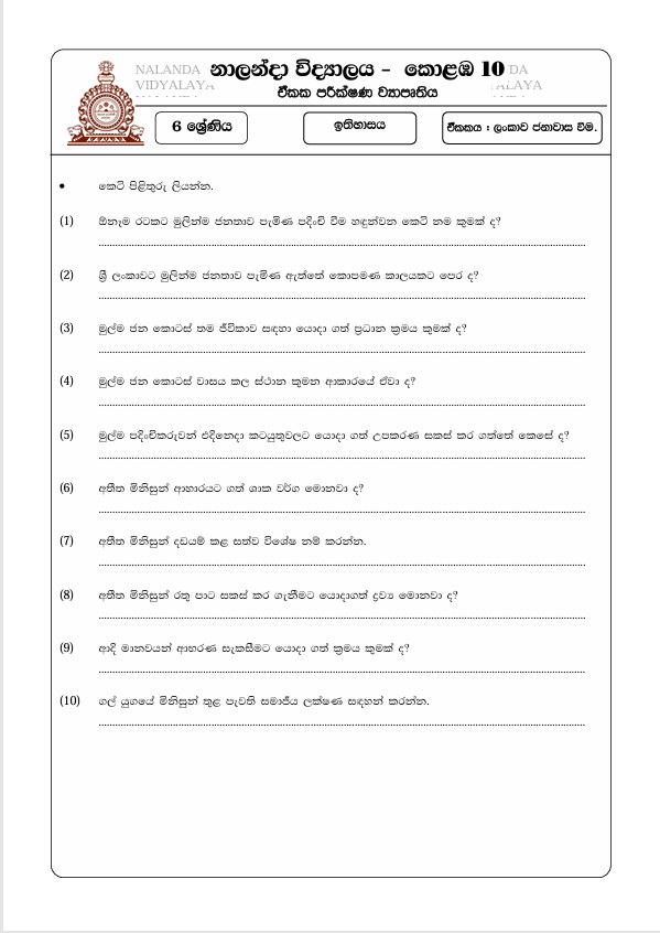 Western Province Grade 06 History Third Term Past Paper 2018