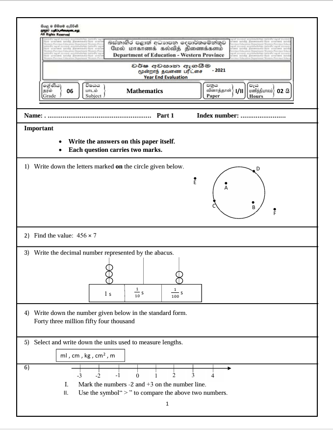 Western Province Grade 06 Mathematics Third Term Paper 2021 – English Medium